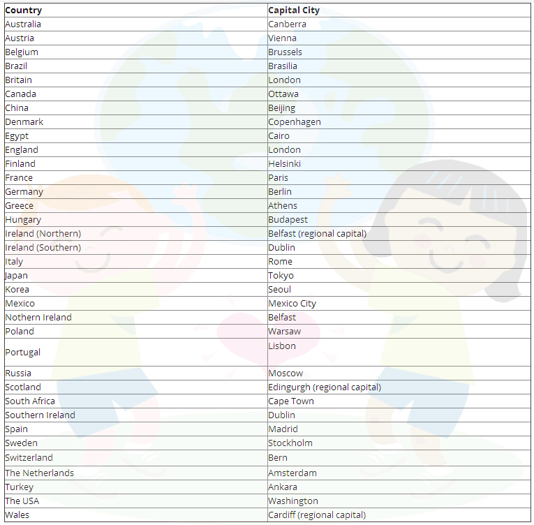 To print the lesson on learning on learning about countries and their capital cities in English. Right click on a white space and choose print. You can click on the printer icon just below and to the right of the contact us menu button at the top of the page or copy and paste the part of the exercise you want onto a word document and then print onto some paper.