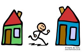 prepositions the man is in between the housesRelationship between the houses and the man.