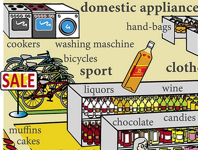 1 Supermarket trolley 2: Bread and cakes shelves 3: Small plastic bags for fruit and vegetables 4: Meat 5: Butcher 6: Drinks
