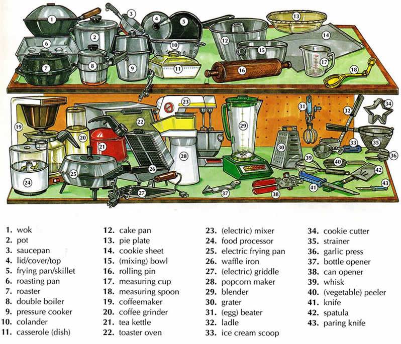 The last part of the English lesson you will learn how to talk about kitchenware / utensils used in a kitchen.