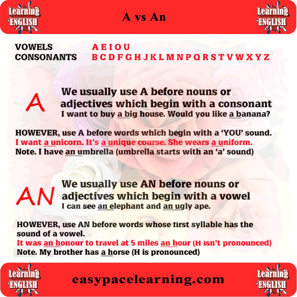 A and an have the same meaning and are both called articlesA an English lesson book of words