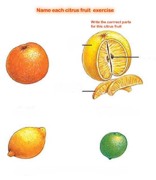To complete the exercise write the names next to the citrus fruit. When you have finished write the words for each part next to the black lines.